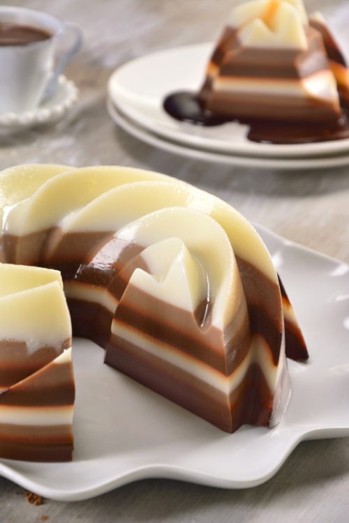 Prepara las gelatinas de chocolate, vainilla y anís, deja enfriar y reserva.