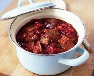 En una cacerola grande, derretir la mantequilla y saltear los champiñones hasta que estén tiernos. Reservar. En una plancha para bifes, cocinar las fetas de jamón crudo hasta que estén crocantes. Reservar. En una cacerola grande, mezcla la harina con el extracto de tomate, el vino y los condimentos. Cocinar unos segundos y agregar los cubos de carne. Cocinar a fuego lento 2 horas, revolviendo de vez en cuando. Incorporar la cebolla, los champiñones y el jamón crocante cortado en trozos. Cocinar 1 hora más y agregar un poco más de vino si fuera necesario.