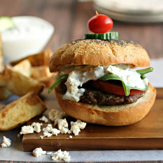 Precalentar el horno a 180°C (horno moderado). En un bol, combinar el queso feta desgranado, con las olivas, el jugo de limón y el yogur. Colocar las hamburguesas recién cocidas en los panes y dividir la mezcla en forma pareja en cada pan. Agregar una rodaja de tomates encima y hojitas de menta. Colocar en una placa para horno. Hornear 5 minutos. Servir al plato caliente.