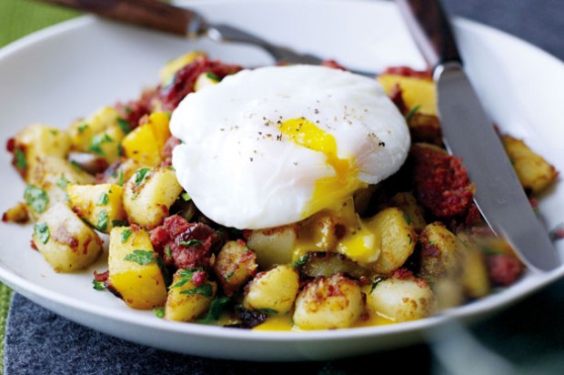 En una sartén, agregar el pimiento cocido, las papas, las cebollas y la carne enlatada. Revolver ocasionalmente los contenidos hasta que las papas estén doradas luego de 15 minutos. En otra sartén, agregar la manteca y freír los huevos; condimentar con sal y pimienta; dejar a un lado. Colocar queso sobre la carne enlatada y dejarlo derretirse durante un minuto. Servir la carne enlatada en un plato y colocar los huevos fritos encima.