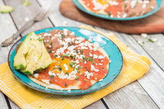 En una sartén, rehogar el tomate, el chile y el ajo durante 5 minutos. Retirar del fuego y procesar. Condimentar con sal y pimienta al gusto, y reservar. En otra sartén bien caliente con un poquito de aceite, dorar las tortillas durante 30 segundos. Retirar las tortillas y dejar escurrir el exceso de aceite. En la misma sartén, freír los huevos cuidando que no se revienten las yemas. Una vez que las claras se cocinaron, darlos vuelta y dejar cocinar durante otros 15 segundos. Retirar inmediatamente del fuego y de la sartén para evitar que se sobre cocinen. Colocar 2 cucharadas de porotos refritos en cada tortillas y luego colocar el huevo encima. Rociar con la preparación de tomate. Condimentar con sal y pimienta al gusto.