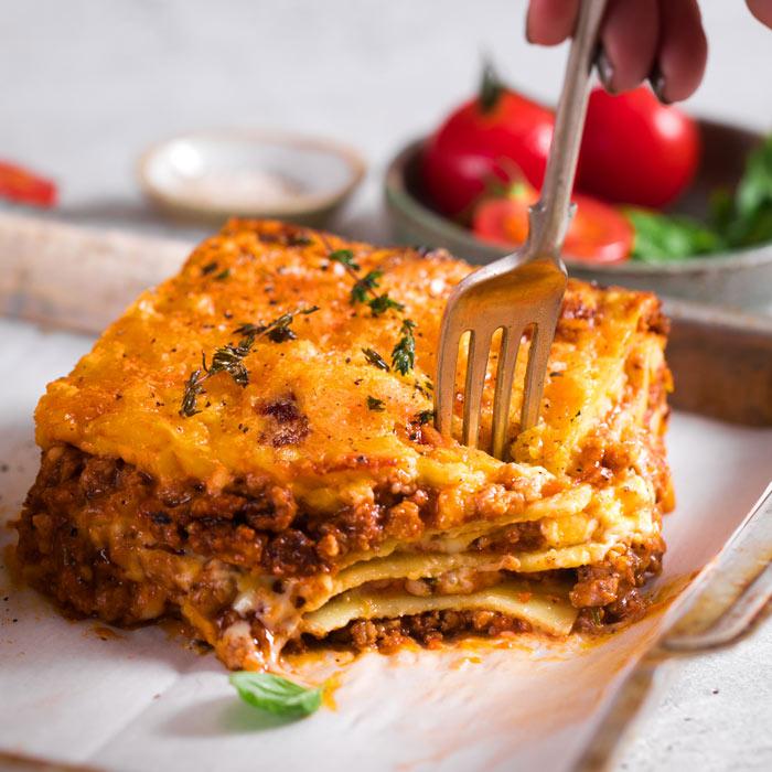 Dorare la carne picada en una sartén sin aceite, hasta que esté bien cocida. Reservar. Precalentar el horno a 190°C (moderado). Enmantecar una fuente rectangular mediana (más o menos entran 3 o 4 hojas de lasaña, un poquito encimadas). En un bol, batir el huevo con el requesón, la mitad de la mozzarella y el queso parmesano. Sazonar con sal, pimienta y nuez moscada a gusto. Verter suficiente salsa de tomate en el fondo de la fuente, y cubrir con 3 o 4 hojas de lasaña. Colocar 1/3 de mezcla de requesón, y luego cubrir con la mitad de la carne picada. Distribuir la mitad del resto de la mozzarella y luego cubrir con con la mitad de la carne picada. Distribuir la mitad del resto de la mozzarella y luego cubrir con 1/2 lata de tomate. Repetir el mismo procedimiento hasta usar todos los ingredientes. Terminar con salsa de tomate y queso mozzarella por arriba. Cubrir con papel aluminio y llevar al horno por 50 a 60 minutos. Retirar el papel aluminio, y dejar que se dore por 5 a 10 minutos. Dejar reposar por 15 minutos antes de servir.