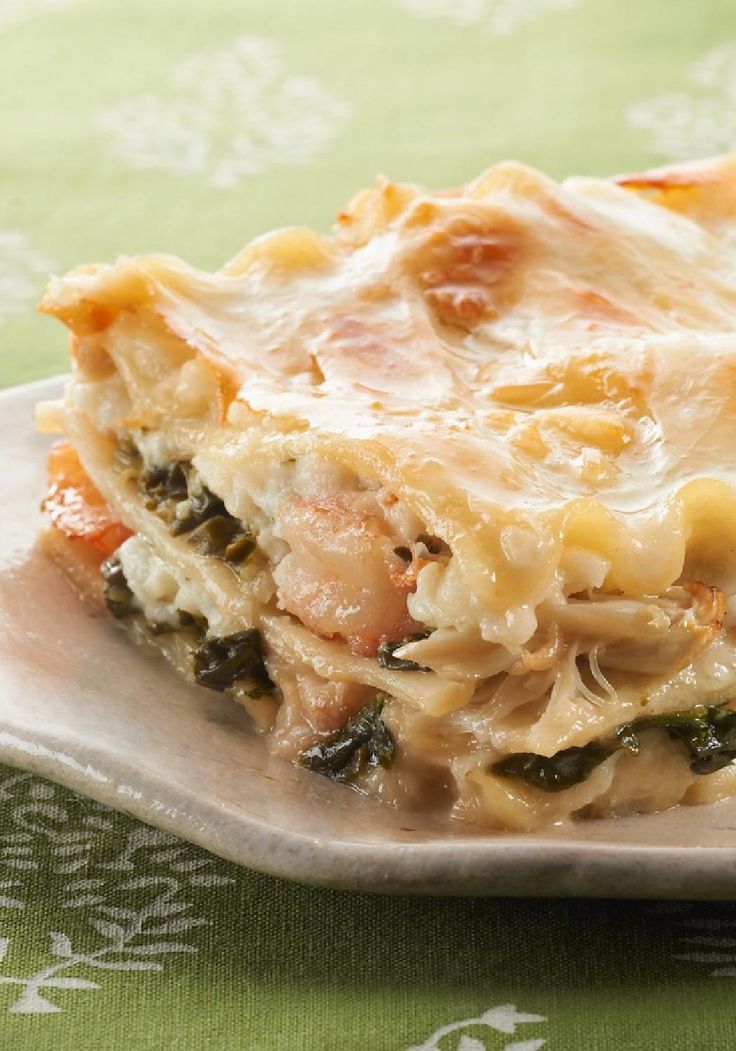 Precalentar al horno a 180°C. Calentar 2 cucharadas del aceite en una olla. Agregar el hinojo, la cebolla y la mitad del ajo. Cocinar hasta que la cebolla se ablande. Agregar el perejil, las semillas de hinojo, las hierbas italianas y el pimiento, y cocinar 1 minuto. Incorporar los camarones y los mariscos surtidos, y cocinar 30 segundos. Con una espumadera pasar los mariscos e un bol y reservar. Agregar el vino, el caldo, la càscara de limón, los hojas de laurel y la zanahoria a los jugos que quedan en la olla. Hervir hasta que el líquido se haya reducido a uno 100 ml. Anadir los tomates y cocinar a fuego alto 3 o 4 minutos, o hasta que la salsa se haya reducido. Agregar las judías y el resto del ajo. Tapar y cocinar 10 minutos. Agregar los espárragos y guisantes y cocinar, tapado, otros 5 minutos. Aceitar un recipiente para horno. Con una espumadera, retirar dos tercios de las verduras de la salsa y colocarlas en e refractario; quitar las hojas de laurel. Cubrir con una capa de masa de lasaña, superponiendo apenas las láminas de masa. Agregar los mariscos y el pescado y una segunda capa de lasaña. Verter el resto de las verduras y la salsa. Terminar con una última capa de lasaña. Mezclar el requesón con los huevos y el queso parmesano. Condimentar con un poco de nuez moscada, pimienta y pimienta de Cayena, si se desea. Verter en forma pareja sobre la lasaña y rociar con el resto del aceite de oliva. Hornear 30 minutos o hasta que la lasaña burbujee y la superficie esté dorada. Servir de inmediato en porciones individuales.
