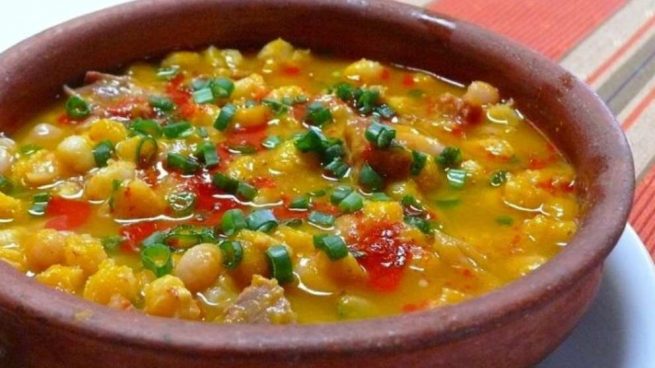 Lavar el maíz y los porotos, remojar desde el día anterior. Cocinar las patitas de chancho al horno y dejar enfriar. Luego, cortarlas en trocitos. Cortar en pequeños trozos la panceta, el mondongo, los chorizos y la carne. Para el día del locro: Colocar en una olla el maíz y los porotos hasta que hiervan y se cocinen por una hora. Agregar el resto de los ingredientes y los condimentos: sal al gusto, pimienta al gusto y pimentón, y mezclar con una cuchara de madera. En una olla aparte, hervir el zapallo con sal y luego pisarlo y hacerlo puré. Agregar el zapallo a la preparación anterior por unos 20 minutos hasta completar su cocción. Para la salsa frita: Calentar el aceite en el sartén y rehogar la cebolla picada y salada. Una vez cocida, retirar del fuego y en caliente agregar parte del pimentón. Incorporar por encima de cada de cada plato con locro.