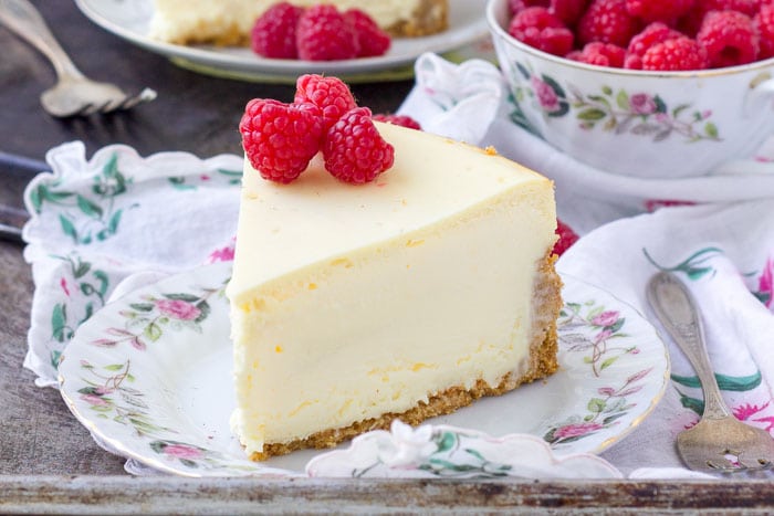 Precalentamos el horno a 165°C y engrasamos un molde desmontable de 18 o 20 cm de diámetro con espray desmoldante. En primer lugar, trituramos las galletas hasta que parezcan pan rallado. Las mezclamos con la mantequilla, fundida, y el azúcar, y cubrimos con ellas la base y los laterales del molde hasta, al menos, unos 2.5 cm de altura. Ponemos en la nevera para que se endurezca. Mientras se enfría, preparamos el relleno. Batimos el queso con el azúcar y la harina hasta que la mezcla sea homogénea, siempre a velocidad lenta si usamos una batidora. Incorporamos los huevos, uno a uno. Finalmente, anadimos la nata, la ralladura de limón y la vainilla, y mezclamos de nuevo para lograr homogeneidad. Sacamos la base de la nevera y rellenamos con esta mezcla. Horneamos durante 25 minutos a 165°C con calor arriba y abajo y después bajamos la temperatura a 120°C y seguimos horneando otros 60 minutos, o hasta que toda la superficie haya cuajado y solo quede el centro un poco húmedo. (También puedes usar la técnica del horneado a bano maria). Una vez fuera del horno, esperamos a que la tarta se enfríe a temperatura ambiente y después la ponemos en la nevera durante 4-6 horas (pues prepararla de un día para otro). Luego esperamos al menos 30 minutos, antes de servir, para que vuelva a temperatura ambiente. Servimos acompañada por mermelada casera de frutos rojos, salsa caliente de frambuesas o incluso sirope de nuestro sabor favorito. No olvides mirar la sección de salsa y acompañamientos.