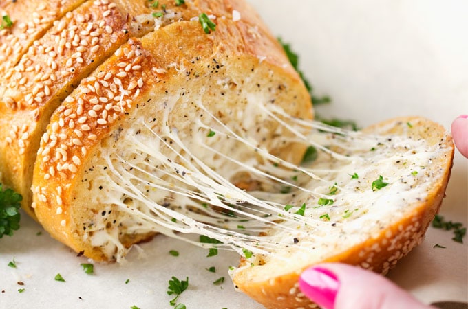 Para las baguettes: En un bol, disolver la levadura en el agua tibia. Dejar reposar por 10 minutos, hasta que empiece a formarse una espuma. En un bol grande, combinar la levadura con 450 cc de agua, 1/3 de harina, sal, azúcar y aceite vegetal. Mezclar bien hasta que se integren bien todos los ingredientes. Incorporar el resto de la harina, de a poco, batiendo bien después de cada adición. Una vez que la masa se separe del bol, colocarlas sobre una superficie enharinada, y amasar por 8 minutos, hasta que la masa esté suave y elástica. Aceitar ligeramente el bol, y colocar la masa y cubrirla bien con aceite. Cubrir con un repasador húmedo y dejar levar en un lugar tibio y seco, hasta que duplique su tamaño, más o menos, durante 1 hora. Dividir la masa en 2 partes. Estirar cada masa en un rectángulo de 23×30 cm, y enrollarlo como se fuese un pionono, a lo largo. Sellar los bordes y colocar la baquetee con la junta hacia abajo sobre una placa para horno, previamente espolvoreada con harina de sémola, o polenta. Con un cuchillo filoso, hacer cortes diagonales en 3 lugares. Pintar con clara batida y espolvorear con semillas de sésamo. Tapar y dejar levar otros 30 minutos. Mientras tanto, precalentar el horno a 200°C (moderado/fuerte). Llevar al horno por 35 minutos, o hasta que se haya dorado. Dejar enfriar. Para el saborizado: Precalentar el horno a 180°C (moderado). Cortar las baquetee por la mitad a lo largo. Mezclar bien la mantequilla con el queso parmesano, la mostaza y el ajo. Picar el perejil hasta que estè bien finito. Untar generosamente la pasta en la baquetee y espolvorear la superficie con el perejil. Llevar al horno. Hornear de 10 a 15 minutos o hasta que se haya dorado ligeramente. Cortar en rodajas en diagonal y servir inmediatamente.