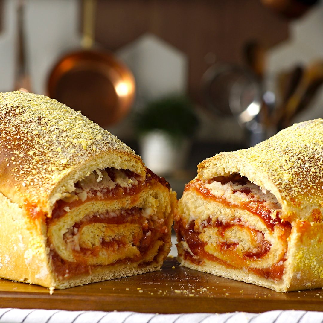 Lleve la leche al fuego, agregue la mantequilla hasta que se derrita. En un tazón pequeño mezcle la levadura, 1 cucharada de azúcar y 1/2 taza de la mezcla de leche. Deje reposar durante 15 minutos. En un procesador o licuadora, bata el maíz y 2 huevos. Colocar la harina en un bol, poner la sal alrededor. Hacer un agujero en el medio, agregar la levadura, la mezcla de maíz y el resto de la leche con mantequilla. Mezclar bien con una cuchara de pan y luego con las manos pasar a una superficie enharinada y amasar la masa durante 20 minutos. Cuando esté muy lisa y suave, muévala a un bol y cúbrala con un paño. Deja reposar 2 horas, pasada la primera 1 hora, vuelve a amasar el pan para que pierda aire. Estirar la masa con un rollo rectangular. Colocar la cuajada, las rodajas de guayaba y envolver. Coloque en un molde para pasteles inglés engrasado. Pincelar con la mezcla de yema y leche, espolvorear con harina de maíz. Hornear a 200ºC durante unos 50 minutos. Para asegurarse de que esté listo, simplemente toque la parte inferior del pan, si sale un ruido hueco, está listo.