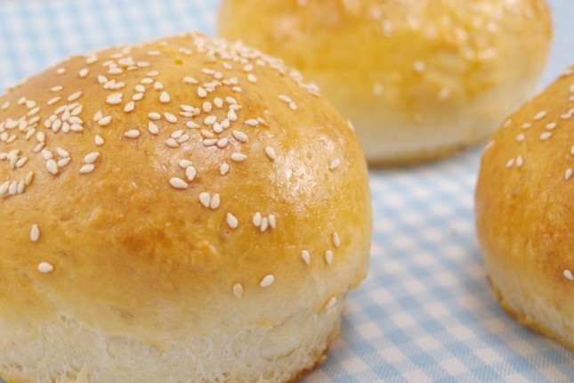 Colocar la levadura en un bol y desgranarla con un tenedor. Incorporar el azúcar con la leche tibia y dejar espumar. Poner la harina junto con el azúcar y la sal en la mesa en forma de volcán. En el centro poner la mantequilla a temperatura ambiente, los huevos y la levadura espumada (tardará un ratito en hacerse espuma). Mezclar los ingredientes del centro con la mano e ir incorporando la harina de los costados y la leche poco a poco. Formar una masa tierna y suave, hay que amasar durante un buen rato hasta conseguir la masa. Hacer una bola y taparla con un papel film aceitado y un trapo y dejarla descansar hasta que duplique el tamaño. Poner la masa en la mesa de trabajo previamente enharinada y desgasificarla dándole golpecitos. Tomar con la mano porciones de 35-40 gr de masa (un total de 24 unidades). Formar bollitos y acomodarlos con placas de horno cubiertos con papel de horno. Aplanarlos un poco y dejarlos levar. Hornear a 200°C calor arroba-abajo durante 25 minutos. Retirar y dejar enfriar antes de utilizar.