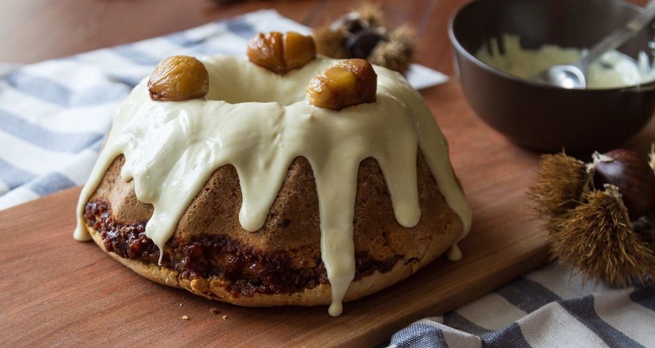 Lavamos las castañas, las colocamos en un bol y las cubrimos de agua. Las calentamos durante 15 minutos a máxima potencia en el microondas o al baño María. Retiramos las castañas del bol y las dejamos enfriar un par de minutos, después las pelamos cuidadosamente. En un vaso batidor agregamos las castañas, reservando 5-6 para decorar, e incorporamos 40-50 g de leche caliente, trituramos con una batidora y reservamos esta crema de castañas. Precalentamos el horno a 170ºC. En un bol, fundimos el chocolate en el microondas de 30 en 30 segundos a baja potencia, o al baño María, y reservamos. Separamos las claras de las yemas y montamos las primeras a punto de nieve con ayuda de una batidora eléctrica, es decir, hasta que se forma una especie de espuma consistente que forme picos suaves. En un bol, clarificamos las yemas, las batimos enérgicamente con el azúcar hasta conseguir una mezcla amarilla clara y que doble ligeramente su volumen. Añadimos la crema de castañas a la mezcla, junto con el aceite y la harina de maíz y mezclamos suavemente con unas varillas. Vertemos el chocolate fundido y seguimos mezclando suavemente. Finalmente incorporamos las claras montadas con movimientos suaves y envolventes con ayuda de una espátula. Vertemos la mezcla en el molde enmantequillado y enharinado, y horneamos 30-35 minutos o hasta que al pinchar con un palillo, éste salga limpio. Dejamos atemperar encima de una rejilla y una vez que enfríe un poco, y que la masa se separe de las paredes, desmoldamos cuidadosamente. En un cazo fundimos el chocolate con 50 g de agua y espolvoreamos un poco de canela (al gusto), removiendo constantemente, y a fuego bajo. Presentamos nuestro pastel de castañas sobre una bandeja y con ayuda de una jarra vertemos el glaseado de chocolate especiado. Finalmente coronamos nuestro pastel con castañas.