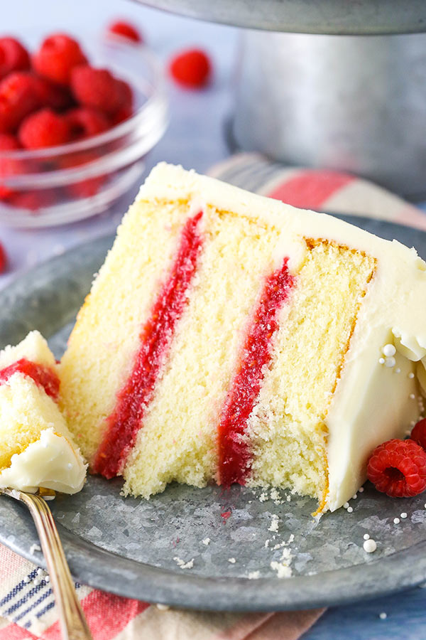 Precaliente el horno a 350°F (176°C) y prepare tres moldes para pasteles de 8 pulgadas con papel pergamino en la parte inferior y spray para hornear en los lados. Combine la leche, los huevos, el aceite vegetal y el extracto de vainilla en un tazón grande, luego separe aproximadamente 3/4 de taza de la mezcla en otro tazón o taza medidora. Aproximadamente 1 1/4 tazas deben permanecer en el otro recipiente. Pon ambos a un lado. En un tazón grande, combine la harina, el azúcar, el polvo de hornear y la sal. Con la batidora a la velocidad más baja, agregue la mantequilla sobre una cucharada a la vez, permitiendo que se incorpore antes de agregar la siguiente cucharada. A medida que agrega más mantequilla, la mezcla comenzará a agruparse un poco y debería terminar pareciéndose a arena húmeda. Agregue la mezcla de huevo reservada más grande (aproximadamente 1 1/4 tazas) a la mezcla de ingredientes secos/mantequilla. Revuelva a la velocidad más baja hasta que se incorpore, luego raspe los lados del tazón. Aumente la velocidad a media-alta y bata hasta que esté suave y esponjosa, de unos 45 segundos a un minuto. Raspe los lados del tazón. Baje la velocidad a baja y agregue lentamente la mezcla de huevo restante en una corriente lenta hasta que se incorpore. Raspe los lados del tazón, luego vuelva a acelerar y mezcle hasta que estén bien combinados, unos 10-15 segundos. Retire los pasteles del horno y déjelos enfriar durante 2-3 minutos, luego gírelos sobre una rejilla para que se enfríen por completo. Los pasteles se alejarán un poco de los lados de la sartén a medida que se enfríen. Para hacer el relleno de frambuesa, agregue las frambuesas y el agua a un procesador de alimentos y haga puré hasta que quede suave. Si lo desea, puede colar el puré para eliminar las semillas. Combine el azúcar y la maicena en una cacerola mediana. Agregue el puré de frambuesa. Cocine a fuego medio, revolviendo constantemente hasta que la mezcla se espese y hierva, aproximadamente 8-10 minutos. Divida la masa de manera uniforme entre los tres moldes para pasteles y hornee durante 20-25 minutos o hasta que un palillo insertado salga limpio. Dejar hervir durante 1 minuto, luego retirar del fuego. Refrigera y deja enfriar por completo. Cuando esté listo para construir el pastel, haga el glaseado. Agregue el queso crema y la mantequilla a un tazón grande y mezcle hasta que esté bien combinado y suave. Agregue aproximadamente la mitad del azúcar en polvo y mezcle hasta que esté bien combinado y suave. Agregue el extracto de vainilla y la mezcla de sal hasta que estén bien combinados. Agregue el azúcar en polvo restante y mezcle hasta que esté bien combinado y suave. Para armar el pastel, usa un cuchillo de sierra grande para quitar las cúpulas de la parte superior de los pasteles para que queden planos. Coloque el primer pastel en un plato para servir o en un pastel redondo de cartón. Coloca una presa de glaseado alrededor del exterior del pastel. Extienda aproximadamente la mitad del relleno de manera uniforme sobre el pastel. Coloque el segundo pastel encima y agregue otra presa de glaseado y el relleno de frambuesa restante. Cubra el pastel con la capa final del pastel y congele con el glaseado restante. Si lo desea, use una espátula offset de 9 pulgadas para crear un diseño en los lados del pastel. Coloca conchas alrededor del borde superior del pastel. Utilicé la punta 847 de Ateco. Termine el pastel con algunas frambuesas frescas. Refrigere el pastel hasta que esté listo para servir. El pastel es mejor cuando se deja reposar durante una o dos horas antes de servir para que se acerque un poco más a la temperatura ambiente. El pastel es mejor cuando se almacena bien cubierto durante 3-4 días.