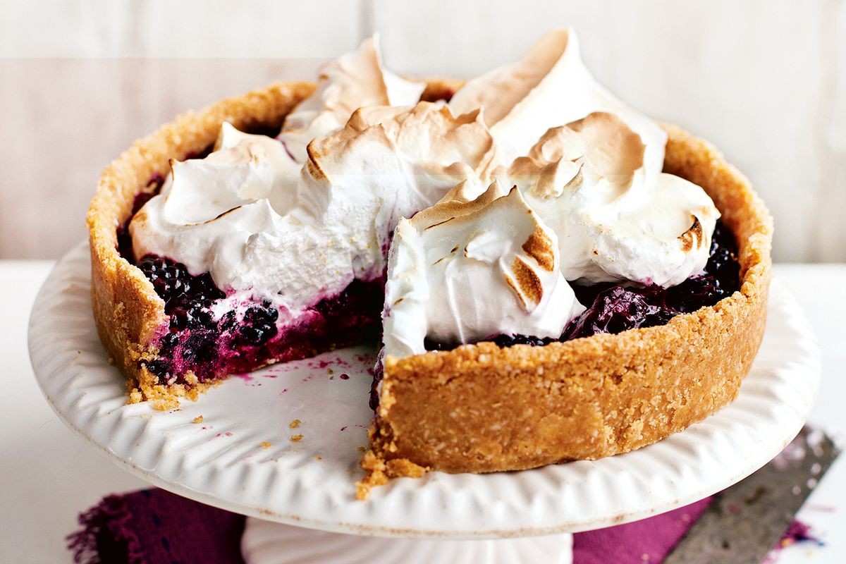 Con la ayuda de las manos, trabajar la harina con la mantequilla hasta formar grumos bien gruesos. Mezclar el azúcar, huevo, ralladura de limón y jugo de limón en la mezcla y amasar hasta formar una masa suave. Guardar en la heladera por 30 minutos. Precalentar el horno a 200°C (fuerte). Enmantecar una tartera de 25 cm de diámetro. Estirar la masa con palote y forrar la tartera, incluyendo los bordes. Pinchar la base de pastel con un tenedor varias veces y llevar al horno por 20 minutos. Dejar enfriar. Mientras tanto, lavar las moras y secarlas bien con una toalla de papel. Colocar las moras en el pastel. Batir las claras a nieve con el agua fría y azúcar. Reservar. En otro bol, batir las yemas hasta que estén bien espumosas, y luego agregar el agua tibia hasta que se pongan bien cremosas. Incorporar las claras a nieve en forma envolvente. Mezclar la harina con el polvo para hornear, e incorporar a la preparación anterior. Estirar merengue sobre las moras dejándolo liso y homogéneo. Llevar al horno por otros 15 a 20 minuto hasta que el merengue esté dorado. Dejar enfriar el pastel antes de desmoldar. Espolvorear con azúcar glas (impalpable)