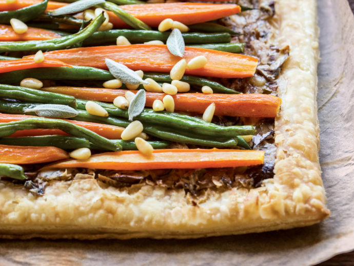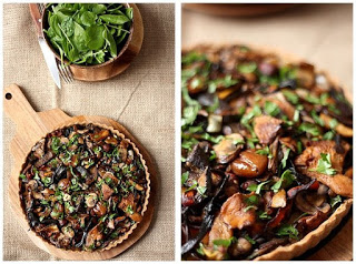 Precalentar el horno a 180°C (moderado). Enmantecar y enharinar una tartera. Cubrir con la masa. Calentar el aceite de oliva en un sartén a fuego medio alto. Agregar la cebolla y los champiñones y saltear hasta que esté todo bien dorado. Anadir la zanahoria y revolver. Agregar el caldo y dejar hervir. Tapar y bajar el fuego a mínimo. Cocinar entre 8 a 10 minutos a fuego suave hasta que las zanahorias estén tiernas. Agregar la salsa de soja y el aceto balsámico. Rociar la sartén con harina, y revolver. Cocinar a fuego lento y revolver hasta que la salsa se espese (1-2 minutos). Retirar del fuego y agregar el tomillo. Agregar la preparación de vegetales a la masa, y extender uniformemente. Cubrir con el otro disco. En un bol, batir el huevo y el agua con un tenedor. Pintar con esta mezcla la superficie del pastel. Llevar al horno y cocinar 35 a 40 minutos hasta que esté dorado. Servir tibio.