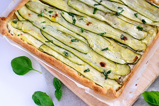 Precalentar el horno a 220°C (horno bien caliente). Enmantecar y enharinar una tartera de 23 cm de diàmetro. Forrar la tartera con el disco de masa y reservar. En una sartén, calentar la mantequilla y cocinar los zapallitos hasta que estén ligeramente doradas y tiernos. Colocar sobre la masa. En un bol, batir juntos los huevos, el queso crema, el requesón y el queso Cheddar. Condimentar bien con sal y pimienta. Verter en la tartera y extender. Llevar al horno. Cocinar 30 minutos o hasta que esté dorada y ligeramente firme. Servir tibio.