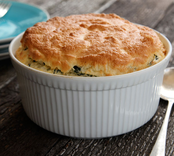 Precalentar el horno a 160°C (bajo). Enmantecar y enharinar una tartera. Para la masa: Cortar la manteca bien fría en cubitos. Agregar la harina y suficiente agua fría para unir con las manos y formar un bollo suave y liso. Darle forma de bola y enfriar en la heladera 30 minutos. Retirar la masa de la heladera y estirar con palote formando un circulo delgado. Usar para forrar la base y los lados de la tartera. Pinchar la base con un tenedor y recortar el excedente de masa. Llevar al horno y hornear sin relleno unos 20 minutos. Retirar y reservar. Para el souffle. Saltear la cebolla en 1 cucharada de aceite de oliva hasta que esté transparente. Agregar la espinaca y cocinar 10 minutos. Procesar la espinaca y la cebolla junto con el queso rallado, el eneldo, sal, pimienta, mantequilla y huevos. Para el armado: Verter la preparación sobre la masa, extender y llevar al horno moderado. Hornear 40 minutos o hasta que dore la masa. Servir tibio.