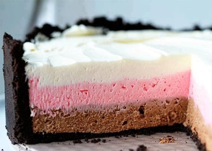 Mezcla la leche condensada y el queso crema con una batidora y vierte sobre el helado de fresa. Lleva al congelador durante 30 minutos o hasta que se afirme. Desmolda y corta en porciones. En la imagen se muestra otra capa de helado sobre la base que no es el de fresa, sino de dulce de leche. Si lo deseas puedes hacerlo como te enseñé yo, o bien, incorporar una tercera capa e incluso intercalar sabores, siempre y cuando, coloques la capa de queso crema en la superficie del molde.