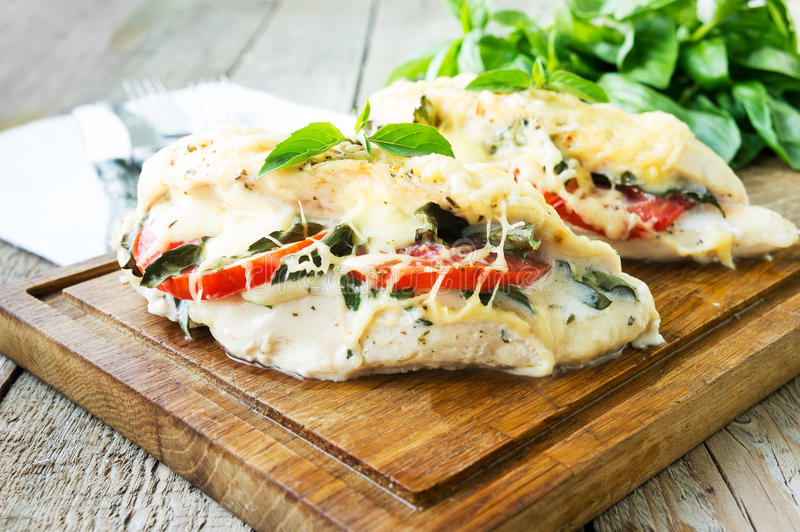 Colocar las pechugas de pollo en una tabla para picar. Con una cuchilla bien afilada, realizar un corte horizontal en las pechugas, sin cortarlas totalmente (como haciendo un bolsillo). Abrir las pechugas come si fuesen un libro. Colocar las pechugas en una bolsa tipo Ziploc con el aceite, las especias y los dientes de ajo picados. Llevar a la heladera por 30 minutos. Precalentar el horno a 260°C (fuerte). Colocar las pechugas en una asadera para horno. Rellenar cada pechuga con 4 hojas de albahaca, 2 a 3 rodajas de tomate y una rodaja de queso y dar vuelta. Si fuese necesario, mantenerla cerrada con escarbadientes. Envolver las pechugas con 3 rodajas de panceta cada una. Llevar al horno por 15 minutos. Dar vuelta las pechugas y cocinar por otros 15 minutos. Retirar del horno y espolvorear con queso parmesano. Volver al horno por 2 a 3 minutos hasta que se haya gratinado.