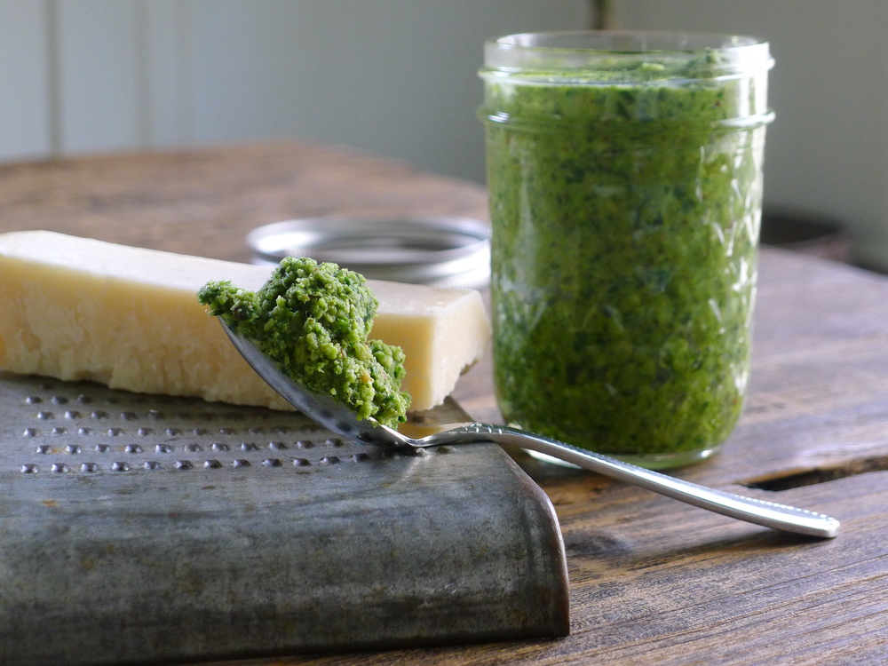 En una picadora ponemos la rúcula, las avellanas -sin piel-, los dientes de ajo pelados -sin el germen-, una pizca de sal, y un chorro generoso de aceite. Picamos todo durante unos segundos y vemos si necesita más aceite, añadiéndolo poco a poco hasta conseguir la textura deseada. Una vez conseguida, lo pasamos todo a un bol, añadimos el parmesano rallado, y mezclamos con una cucharilla. Si es necesario añadimos un poco más de aceite y removemos.