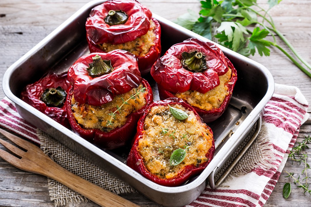 Se pone una sartén al fuego y se caliente el aceite, se echa la carne y se rehoga sazonándola, se añade el tomate picado. Dejamos hacer un poco. Se pica en el mortero el perejil y los dientes de ajo y se añaden a la sartén junto con el arroz, se deja hacer unos minutos, debiendo quedar la mezcla melosa, se rectifica de sal y se aparta. Se preparan los pimientos quitándoles el casquete de arriba, que se reservará para tapadera. Se limpian de semillas y se rellenan de la preparación hasta la mitad del pimiento. Se colocan en una fuente de horno y se tapan cada uno con su casquete, sujetándolo con un