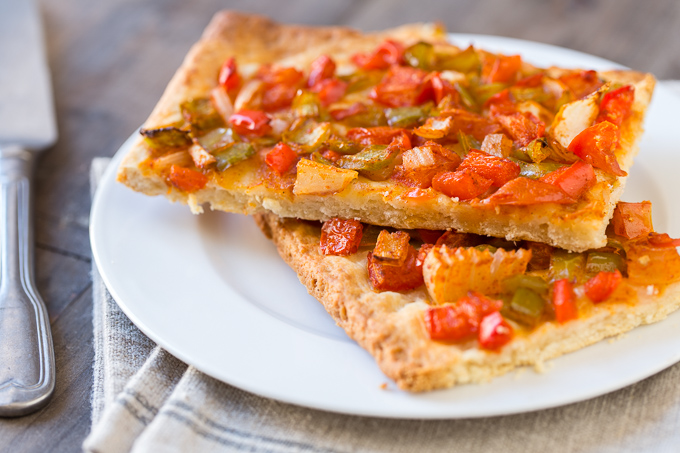 Elaborar el trampó picado finamente la cebolla, los tomates y los pimientos. Colocarlos en un bol y condimentarlos con aceite, sal, pimentón, pimienta y orégano. Reservar. Extender el bollo ligeramente enharinado empleando un rodillo y colocarlo en la placa del horno engrasada con un poco de aceite. Cubrir con el trampó toda la superficie de la masa y hornear durante 15 a 20 minutos hasta que la masa quede cocida y crujiente. Se puede servir caliente o fría.