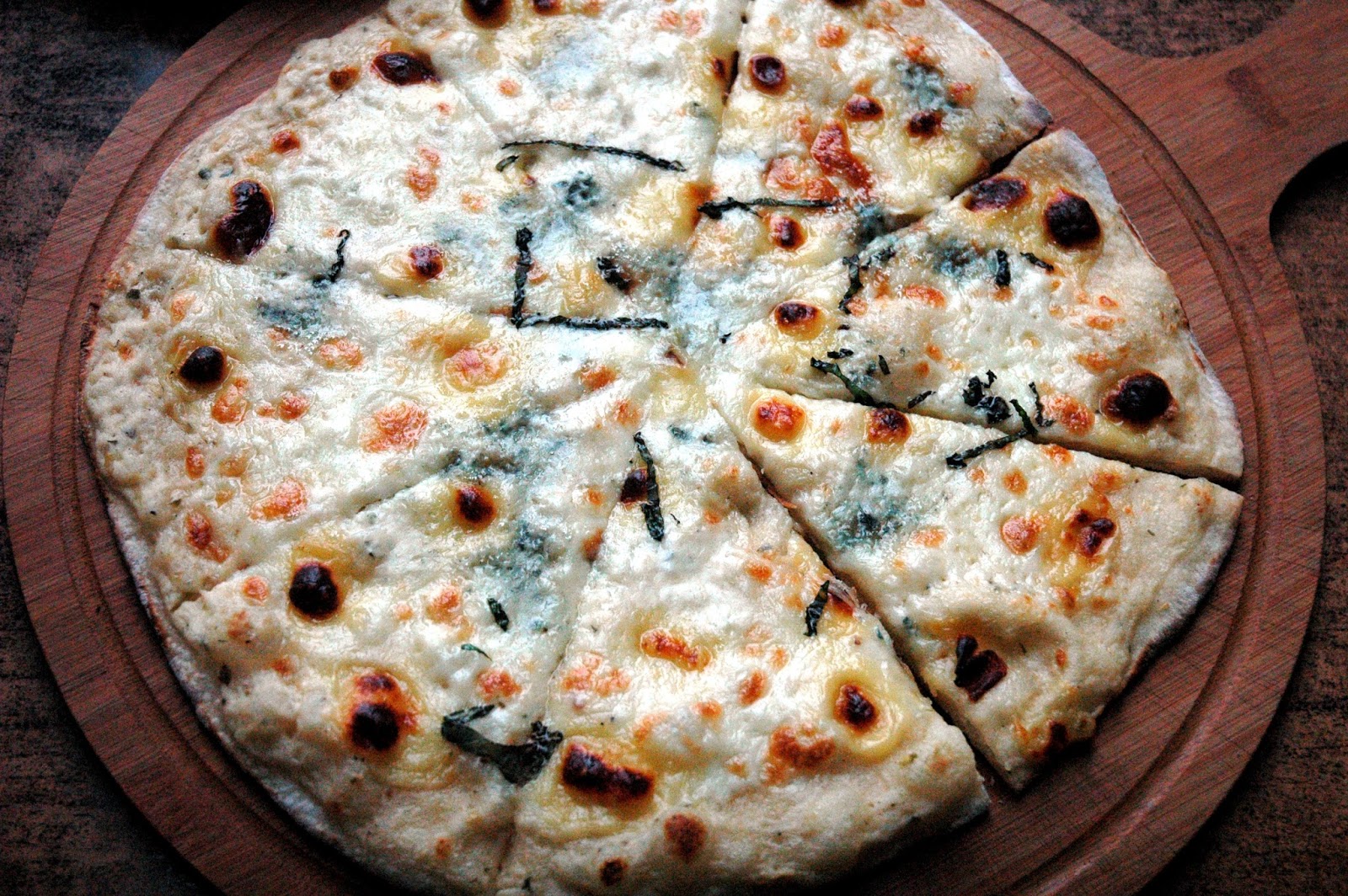 En un bol, disolver la levadura con 1/2 taza de agua. Incorporar 125 gr de harina y mezclar bien. Tapar con film y dejar reposar hasta que se esponje, aproximadamente 1 hora. Anadir el resto del agua , la harina y la sal y mezclar bien. Una vez que se formó la masa, amasarla sobre una superficie enharinada hasta que quede una masa suave y flexible, más o menos por 15 minutos. Volver a un bol enharinado y cubrir con papel film. Dejar leudar 2 a 3 horas en un lugar seco y caliente (por ejemplo, cerca del horno), hasta que duplique su tamaño. Desinflar la masa y estirarla. Dejar reposar por otros 10 a 15 minutos. Mientras tanto, precalentar el horno bien caliente (220°C). Estirar la masa, ya sea con las manos o con la ayuda del palote. Colocarla sobre una pizzera ligeramente aceitada. Pintarla con aceite de oliva y llevar al horno por 8 minutos. Retirar y cubrir con la mozzarella, el queso azul y los dientes de ajo. Unos minutos antes de retirar del horno y condimentar con pimienta a gusto. Volver al horno hasta que se haya dorado.