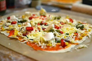 Precalentar el horno a 200°C (horno fuerte). Aceitar ligeramente una pizzera. Estirar el bollo para pizza y cubrir la pizzera. Cubrir la masa con salsa de tomate. Colocar encima las verduras y salpimentar al gusto. Esparcir las olivas y el queso mozzarella y llevar al horno. Cocinar 20 a 25 minutos. Servir de inmediato.