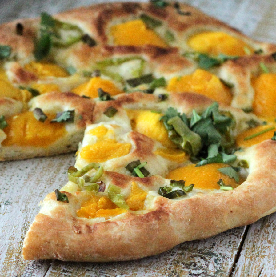 En una sartén, sofreír en aceite la cebolla picada, anadir el tomate frito, condimentar con orègano, pimienta, pimentón y sal al gusto. Dejar cocinar unos 10 minutos a fuego lento y reservar. Extender la masa enharinada ligeramente empleando un rodillo y colocarla en un molde para pizza egresado con un poco de aceite. Cocinarla en el horno unos 8 a 10 minutos, retirarla y cubrirla con la salsa de tomate. Extender por encima las lonchas de jamón, los quesos rallados y las mitades de melocotón escurridas previamente y cortadas en finos gajos. Decorar con la olivas rellenas unos 5 minutos más para que el questo se derrita.