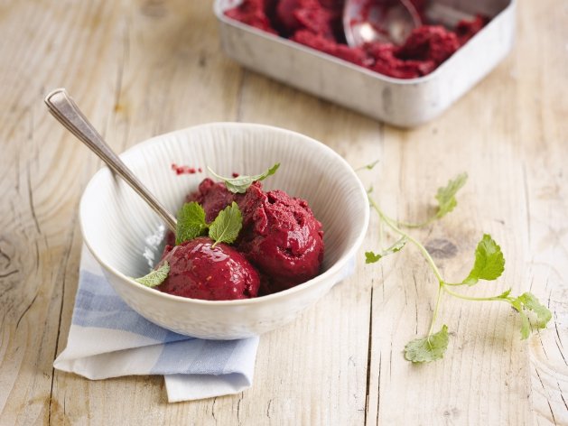 Hervir los frutos rojos en su proprio jugo, hasta que hayan explotado. Pasar por un colador, obteniendo más o menos 350 cc de jugo de frutos rojos bien concentrado. Dejar enfriar. Mezclar la preparación anterior con el azúcar, luego anadir el queso crema y la nata (crema de leche). Mezclar bien y dejar en la heladera por unas horas. Preparar el helado de acuerdo a las instrucciones de la máquina de helado. Una vez listo, guardarlo en un envase sellado en el freezer.