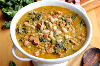 Poner en una olla, el aceite y saltear los ajos cortados en trozos pequeños, agregar el pimiento cortado en trozos, el jamón cortado en tacos y la zanahoria cortada en dados, rehogada un poco. Agregar el salteado de verduras y saltear, hasta que las hortalizas se vean transparentes. A continuación incorporar las acelgas, mezclar, sazonar y tapar con una tapadera para que las acelgas se reduzcan. Remover de vez en cuando. Una vez las acelgas hayan cambiado de color, agregar el laurel molido y un poco de pimienta molida al momento. Cubrir las verduras con caldo y cocer con la olla tapada. Una vez estén cocidas, lavar las alubias con agua fría, colar y incorporar a la olla meneando por las asas, nunca con cuchara porque las alubias se rompen. Cocer cinco minutos más, rectificar de sal y si el potaje he quedado muy liquido, anadir la cucharada de fécula de maíz en el momento de poner las alubias. Servir caliente en cazuelas.