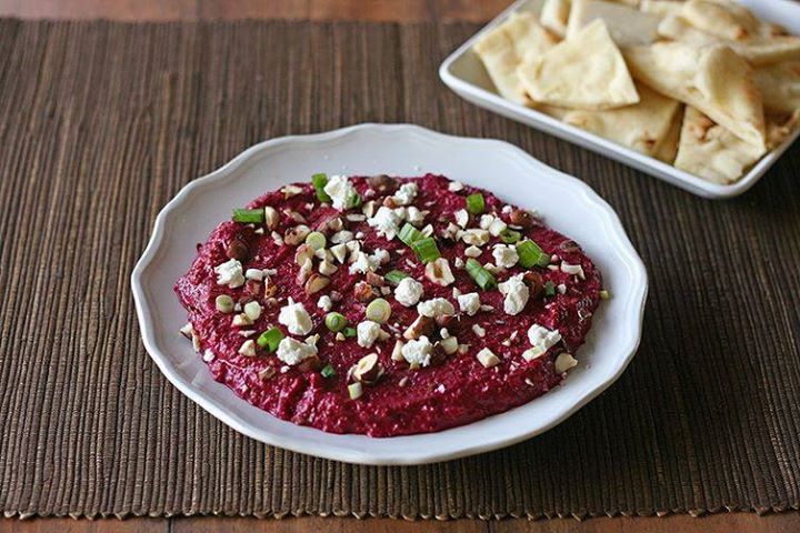Lava 1 remolacha pequeña y ponla aceitada y envuelta en papel de aluminio en una bandeja de horno a 170°C; ásala (sin tapar) durante una hora. Picala en trozos. Mezcla la remolacha con 2 dientes de ajo, 1 guindilla, 6 dátiles sin hueso y una pizca de aceite y tritura. Prueba y ajusta de sal. Alina 250 g de yogur griego con un poco de aceite, limón, sal y pimienta. Bate bien. Pela el aguacate y riega la pulpa con limón. Pon la crema en boles, en el centro, el yogur, el aguacate y espolvorea con sésamo tostado. Sirve fría o templada.