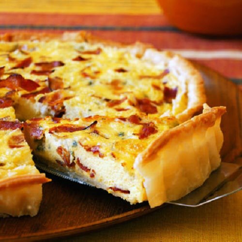 Para la masa: Mezclar la harina con la sal y mantequilla blanda en la batidora de pie a baja velocidad hasta que se forme una masa bien grumosa. Agregar agua y luego mezclar con las manos, quedando una masa lisa y suave. Cubrir con papel film y llevar a la heladera por 30 minutos. Para el relleno: En un sartén a fuego bajo, dorar el bacon hasta que quede bien crocante. Retirar y dejar secar sobre un papel de cocina. Para el armado: Enmantecar una tartera desmontable. Estirar la masa con pelote u forrar la tartera. Pinchar con tenedor varias veces, y guardar en la heladera por otros 30 minutos. Precalentar el horno a 200°C. Batir los huevos con la nata, yemas, sal, pimienta y nuez moscada. Colocar las lonchas de bacon sobre la masa. Cubrir con la crema. Llevar al horno por 15 minutos, luego bajar la temperatura a 180°C (moderado) y cocinar por otros 15 minutos más. Servir tibia.