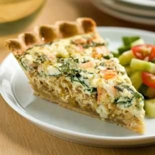 Precalentar el horno a 180°C (moderado). Forrar una tartera previamente enmantecada con la masa de hojaldre. Reservar. Espolvorear la mitad del queso sobre la masa. Cubrir con el kunikama picado, la espinaca y los langostinos (distribuirlos lo más uniformemente posible). Guardar 6 o 7 langostinos para decorar. Batir los huevos en un bol. Anadir la nata y salpimentar a gusto. Verter la preparación sobre el pastel y espolvorear con el resto del queso rallado. Llevar al horno durante 45 minutos. Servir tibia y decorar con los langostinos.