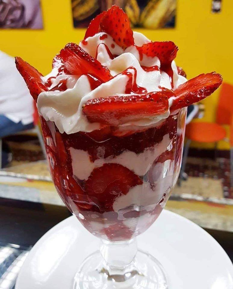 Utilizar vasos o copas, hacer capas utilizando las fresas y la crema (es decir: una capa de fresas, a continuación, una capa de crema, y así sucesivamente). Rocíe con leche condensada, si lo desea, y servir de inmediato. Al final añade jarabe de fresa.