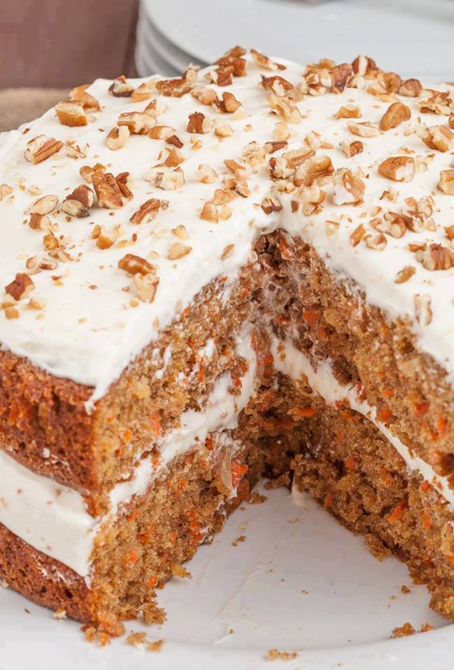 Precalienta el horno a 180°C. Cierne la harina, el azúcar, el bicarbonato, la canela y la sal. Agrega los ingredientes secos a la batidora, sin dejar de batir añade los huevos uno a uno y el aceite hasta integrar. Agrega las zanahorias y bate por 5 minutos más. Añade las nueces y bate ligeramente. Divide la mezcla y vierte sobre dos moldes redondos previamente engrasados y enharinados. Hornea por 1 hora o hasta que al introducir un palillo esté salga limpio. Para el betún, bate la mantequilla hasta acremar, agrega el queso crema con el azúcar y la vainilla hasta que quede una mezcla suave. Desmolda los pasteles, unta un poco de betún sobre uno de estos y cubre con el otro pastel. Decora con el resto del betún y las nueces. Puedes agregar un poco de ralladura de limón al betún para darle un toque acidito.