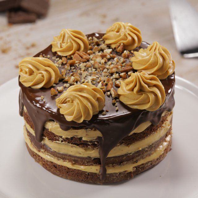 Precalienta el horno a 180°C y engrasa y enharina 2 moldes para pastel de 20 cm de diámetro. Para el pastel: En un bowl mezcla todos los secos. Reserva. En la batidora , bate los huevos con la leche, el aceite y la vainilla. Agrega poco a poco los secos sin dejar de batir, hasta incorporar. Vierte la mezcla en los moldes y hornea alrededor de 30 minutos o hasta que estén cocidos. Enfría y desmolda. Empareja y corta en mitades para formar 4 pisos. Para el betún, en una ollita a fuego bajo derrite el azúcar y cocina sin mover hasta que tenga un color ámbar. Agrega la mantequilla y cocina 4 minutos o hasta que se derrita. Apaga y agrega la crema para batir, mezcla hasta incorporar. Enfría. Coloca la salsa de caramelo en un bowl y agrega poco a poco el azúcar glass y la leche, bate hasta obtener un betún. Arma el pastel colocando una capa de pastel, betún de caramelo y nueces. Repite hasta terminar. Decora con más betún, el chocolate derretido y nueces picadas.
