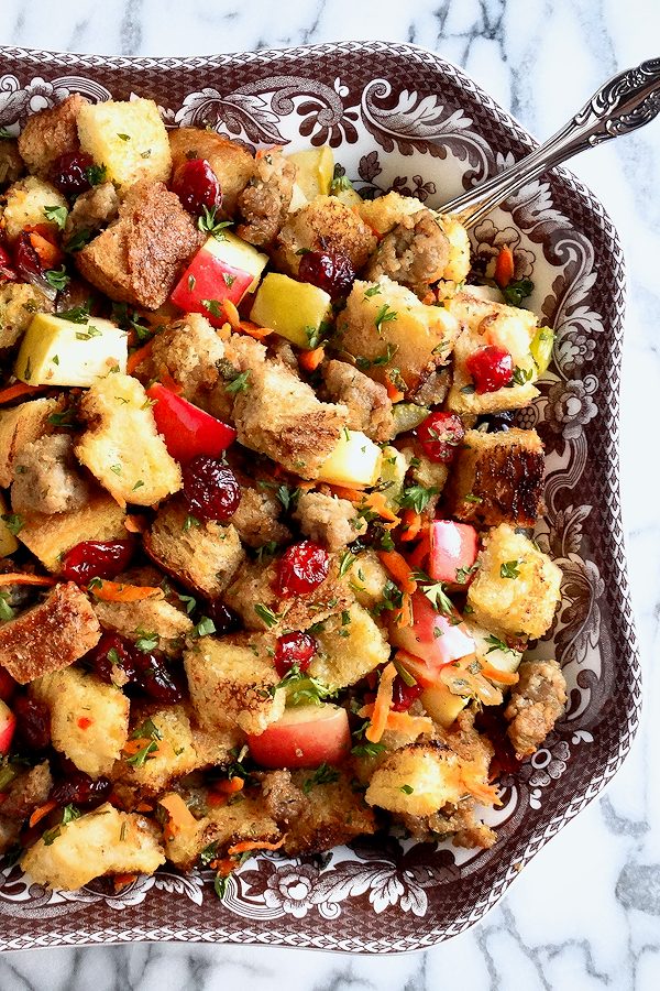 Calienta en una olla el aceite, fríe la cebolla, apio y salchichas hasta que todo empiece a dorar. Agrega la salvia, romero y tomillo hasta que se integren, agrega el caldo de pollo hasta que empiece a hervir.Sazona con sal y pimienta. Retira del fuego, agrega las manzanas y el perejil. Mezcla con el pan dorado. Vacía a un molde para hornear. Barniza con la mantequilla derretida. Hornea solo a que se caliente. Sirve de inmediato