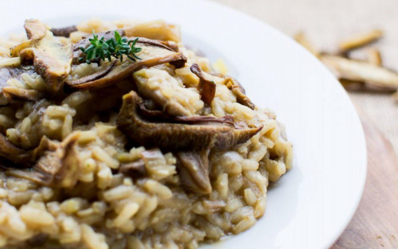 Precalentar el horno a 180°C (moderado). Colocar las nueces en una bandeja para horno y hornearlas hasta que desprendan su aroma (alrededor de 5 minutos). Revuelva una a dos veces para un tostado parejo. Calentar el aceite en una cacerola grande a fuego medio alto. Saltear la cebolla y los champiñones hasta que estén tiernos y dorados. Verter el caldo y llevar a ebullición. Agregar el arroz, bajar el fuego lento hasta que el arroz esté tierno y el liquido se haya absorbido, aproximadamente 20 minutos. Si después de 20 minutos todavía hay liquido, retirar la tapa, y cocinar hasta que el liquido se hay consumido. Retirar del fuego e incorporar las nueces. Sazonar con sal y pimienta al gusto.