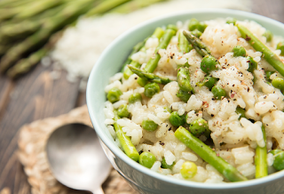 Hervir el caldo en una cacerola grande. Luego reducir el fuego, y anadir las puntas de espárragos, zanahorias, arvejas y habas, y cocinar durante 4-5 minutos hasta que todo este tierno. Retire las verduras con una espumadera y dejar de lado. Mantener el caldo hirviendo a fuego lento. Mientras tanto, calentar el aceite en una sartén grande e incorporar los puerros. Freír durante 2 minutos hasta que estén de color verde brillante, a continuación, agregar el arroz. Anadir 2 a 3 cucharadas de caldo caliente y cocinar a fuego lento, revolviendo hasta que el caldo, un poco a la vez, hasta que la mezcla es espesa y los granos de arroz estén tiernos pero al dente. Esto tomará unos 20 minutos. Agregar el pesto y sazonar a gusto. Anadir los espárragos, zanahorias, arvejas, y habas; y cocinar por unos minutos más hasta que las verduras estén bien calientes. Servir en platos hondos, decorado con pinones por arriba.