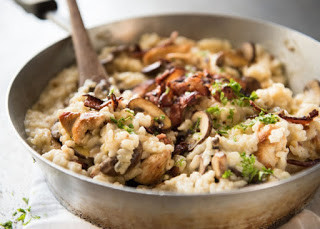 Calentar el aceite en una sartén honda a fuego medio. Anadir la cebolla y cocinar por 3 minutos, luego agregar el ajo y revolver por 2 minutos más hasta que la cebolla se ablande. Agregar el arroz a la cacerola y revolver durante 1 minuto. A continuación, anadir el vino o el vermú y cocinar revolviendo, hasta que casi todo el liquido se haya evaporado. Colar los hongos secos, reservando el líquido de remojo. Agregar los champiñones frescos al arroz, y luego empezar a anadir el caldo caliente, una cucharada a la vez. Cuando todo se haya absorbido, anadir poco a poco el líquido de remojo de los hongos secos y continuar la cocción hasta que el arroz esté tierno. Incorporar los porcini remojados y la mantequilla, tapar y retirar del fuego. Dejar reposar durante 5 minutos, sazonar a gusto y servir espolvoreando con queso parmesano y perejil.