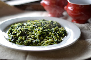 Calentar la manteca y el aceite de oliva en una cacerola grande. Saltear la cebolla hasta que esté blanda. Agregar el ajo y el arroz. Revolver y cocinar 1 minuto. Agregar 1 litro de caldo caliente y reservar el resto. Condimentar con sal, pimienta, y dejar hervir. Volcar todo en la olla de cocción lenta y programar para cocinar 2 horas a temperatura baja. Recalentar el resto de caldo y agregar a la olla de cocción lenta. Tapar nuevamente y cocinar 30 minutos. Poner las verduras encima del arroz, no hace falta agregar más liquido a la cacerola, tapar y cocinar 30 minutos más. Servir decorado con recula y queso rallado.
