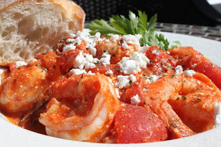 Colocar los camarones en una cacerola con suficiente agua para cubrirlos. Hervir durante 5 minutos, escurrir y reservar el caldo. Calentar 2 cucharadas de aceite en otra cacerola. Rehogar la cebolla revolviendo constantemente hasta que se haya puesto transparente. Agregar el perejil, el vino, los tomates, el ajo y el aceite de olivo restante. Cocinar a fuego lento, revolviendo ocasionalmente, durante 30 minutos o hasta que se espese la salsa. Mientras la salsa se está cocinando, los camarones deben haberse enfriado lo suficiente como para limpiarlos. Eliminar primero las patas tirando de la punta con tus dedos. Retirar la cubierta dura, dejando la cola que se ve muy bien en los platos. Incorporar los camarones a la salsa espesa y dejar cocinar a fuego suave durante 5 minutos. Agregar el queso y retirar del fuego. Dejar reposar hasta que el queso comience a derretirse. Servir caliente.
