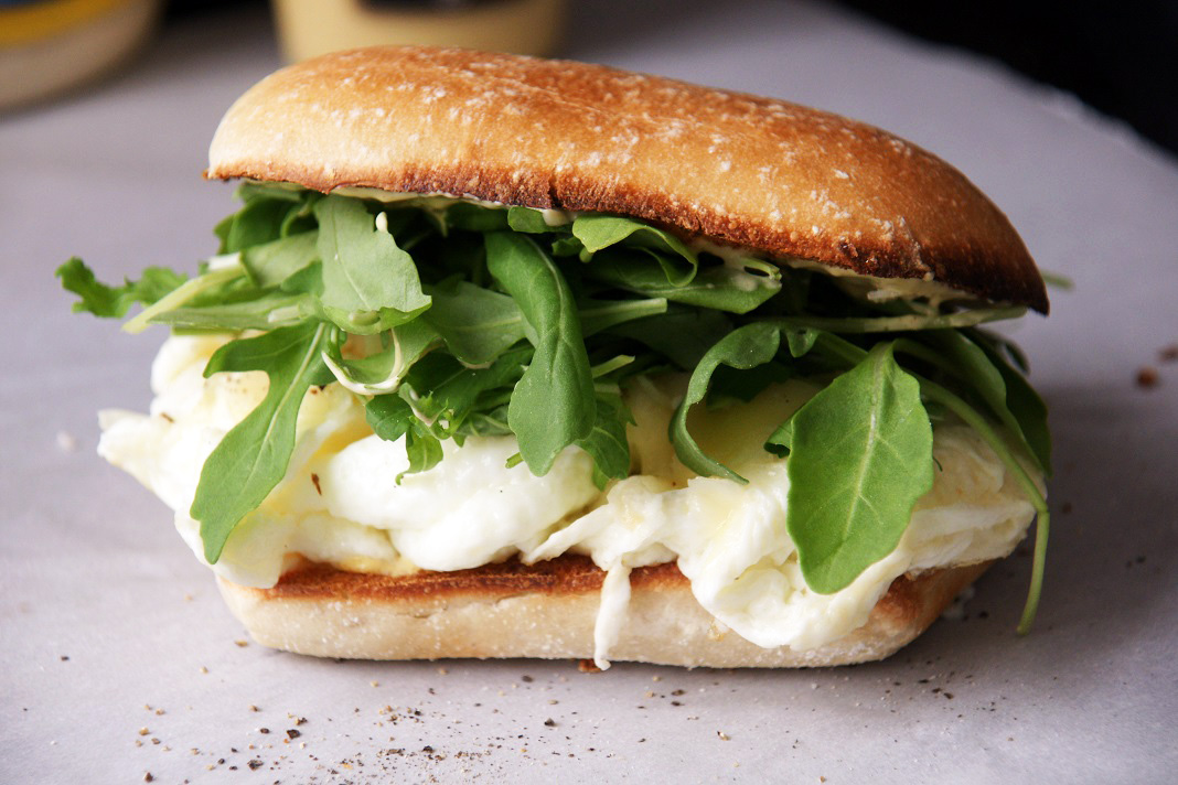Tostar ligeramente el pan de molde integral. Picar los huevos en trozos pequenos y mezclar con la mayonesa light y la mostaza. Untar los panes con esta preparación, agregar una buena cantidad de rucula o las hojas verdes que hayas elegido. Cortar los sándwich por la mitad en triángulos y servir. Es conveniente y queda muy rico acompañar con una ensalada de vegetales frescos, por ejemplo de zanahoria rallada y remolacha o de col.