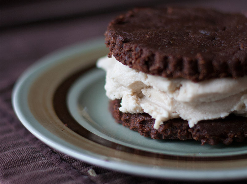 Precalentar el horno a 180°C. Forrar un refractario grande con papel encerado. Cernir la harina y la cocoa. Colocar la mantequilla y cocoa en un tazón a banomaria hasta que se derritan. Retirar del banomaria, agregar el azúcar, el chocolate semi amargo y la sal. Agregar los huevos y la vainilla hasta integrar. Anadir la harina y cocoa hasta mezclar. Vaciar sobre el pirex. Hornear de 20 a 30 minutos o hasta que al insertar un palillo éste salga limpio. Dejar enfriar por completo. Usar cortadores de figuras y cortar las que se deseen, siempre en pares. Colocar una galleta, encima helado y cubrir con otra galleta. Seguir el mismo procedimiento con todas. Meter al congelador hasta que estén firmes. Desmoldar y servir de inmediato.