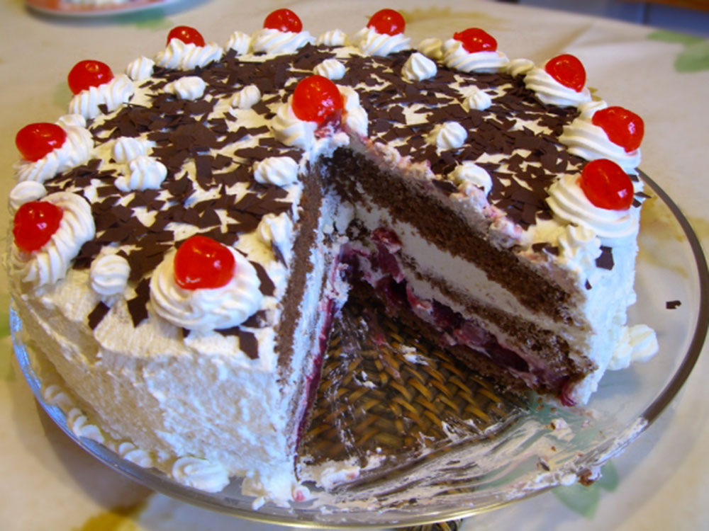 Precalentar el horno a 180°C (moderado). Enmantecar y enharinar dos moldes redondos de 23 cm, u forrar las bases con papel manteca. En un bol grande, combinar la harina, 400 gr de azúcar, el cacao, el polvo de hornear, el bicarbonato y la sal. Agregar los huevos, la leche, el aceite y 1 cucharada de vainilla, batir hasta que estén bien mezclados. Volcar la preparación en los moldes preparados. Hornear 35 minutos o hasta que al insertar un palillo en el centro salga limpio. Dejar enfriar en el molde sobre una rejilla de alambre durante 10 minutos. Desmoldar y dejar enfriar completamente. Para hacer el relleno de cerezas: Colar las cerezas en lata, y reservar 125 cc de jugo. Mezclar el jugo reservado, las cerezas, 200 gr de azúcar y la fécula de maíz en una cacerola. Cocinar a fuego lento hasta que espese, revolviendo constantemente. Agregar 1 cucharadita de vainilla. Dejar enfriar antes de usar. Para hacer el bano de nata batida: Combinar la nata y el azúcar glas en un bol mediano, enfriado previamente en la heladera. Batir con una batidora eléctrica a velocidad alta hasta formar picos duros. Con un cuchillo largo con sierra, cortar cada capa de torta horizontalmente por la mitad. Desmenuzar una de las capas de la torta, y reservar aparte. Separar 1/4 de nata batida para decorar la torta, y colocar en un bol a un lado. Quitar suavemente las migas de la parte superior y de los lados de cada capa de torta. Para el montaje: Colocar una capa de torta en una fuente. Untar con la nata batida, luego cubrir con 180 cc de relleno de cerezas. Cubrir con la segunda capa de torta; repetir la capa de nata y el relleno de cerezas. Cubrir con la tercera capa de torta. Cubrir toda la torta con nata batida. Espolvorear las laterales con las migas de torta reservadas. Colocar la nata batida reservada en una manga de repostería con punta de estrella, y decorar la base y el borde superior. Colocar el resto del relleno de cerezas sobre la parte superior de la torta.