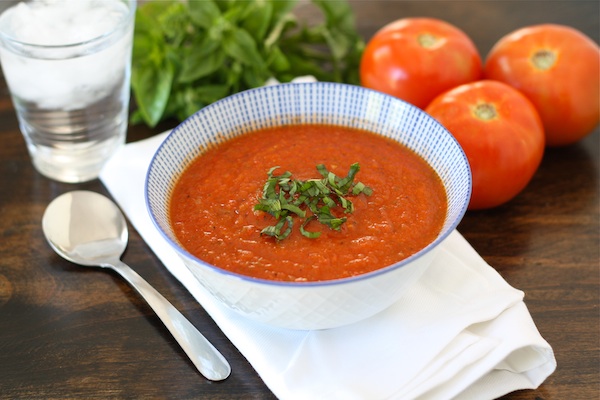 En una cacerola grande, derretir la mantequilla y saltear la cebolla y la zanahoria. Agregar los tomates, la albahaca, sal, pimienta y azúcar. Tapar la cacerola y dejar cocinar 15 minutos. Procesar la preparación hasta que no queden grumos. Agregar el caldo y calentar a fuego lento unos minutos antes de servir.