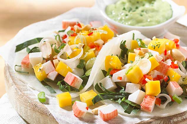 Pela y rebana la jícama (con una mandolina no quedan lo suficientemente delgadas, te sugerimos que le pidas al tendero que lo haga con la rebanadora de jamón). Quita el plástico de las barritas de cangrejo y corta diagonalmente lo más delgado posible. Coloca en un tazón junto con la mayonesa, perejil, jugo de limón y jugo sazonador, salpimienta. Mezcla hasta que se integre. Pon cada rebanada de jícama en un plato, agrega de una a dos cucharadas del relleno y enrolla como taco. Así hasta que hagas todos los taquitos. Para el aderezo pela las barritas quitándole el plástico, corta lo más fino que puedas; pela las ramas de apio y corta finamente. Mezcla con el resto de los ingredientes. Sirve los taquitos acompañados del aderezo.