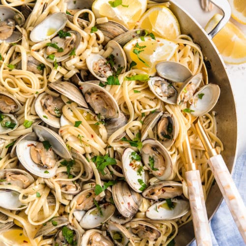 Lavar bien las almejas para quitarle los restos de arena. Cocer la pasta en abundante agua hirviendo con sal, según las instrucciones del envase. Escurrir y reservar. Mientras tanto picar la cebolla y rehogarla con el aceite en una sartén durante 5 minutos a fuego medio. Agregar el caldo de pescado desmenuzado, las almejas y el vino. Tapar y seguir cocinando hasta que las almejas se hayan abierto. Servir la pasta con las almejas por encima.