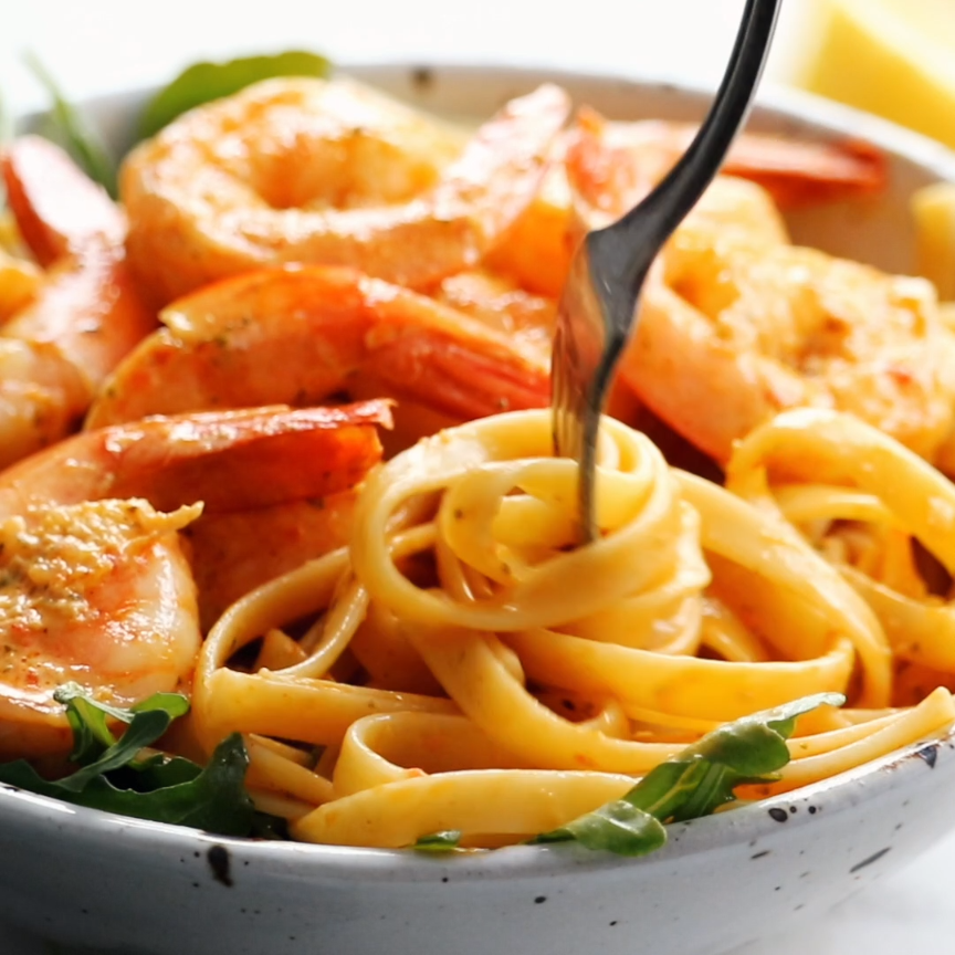 A la hora de servir acomoda los cama- rones sobre los tallarines, rocía con su salsa y adorna con perejil picado.