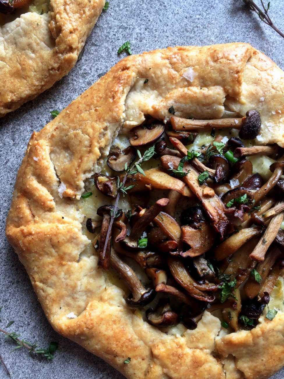 Precalentar el horno a 180° C (moderado). Forrar una tartera con la masa de hojaldre. Reservar. Rehogar el puerro en una sartén a fuego mediano junto con la mantequilla hasta que se ponga transparente, más o menos 5 minutos. Agregar el aceite de oliva y los champiñones, y cocinar por otros 5 minutos. Mientras tanto, en un bol, batir los huevos con la nata. Salpimentar a gusto y sazonar con la nuez moscada. Agregar el queso rallado y mezclar. Colocar el relleno sobre la masa de hojaldre y cubrir con la mezcla de huevo. Llevar al horno durante 30 minutos. Servir la tarta tibia.