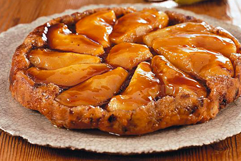 Para hacer la masa: En un bol grande, tamizar la harina y la sal. Anadir el azúcar, la yema de huevo y aproximadamente 1 o 1 1/2 cucharadas de agua fría. Con cuchillo de hoja redondeada, revolver hasta que la mezcla se junte en un bollo. Amasar suavemente sobre una superficie de trabajo enharinada durante unos segundos, hasta lograr un bollo tierno. Envolver en film trasparente y dejar enfriar en la heladera durante unos segundos, hasta lograr un bollo tierno. Envolver en film trasparente y dejar enfriar en la heladera durante 20 minutos antes de usar. Precalentar el horno a 200°C (horno fuerte). Para hacer el relleno: Mezclar las manzanas con el jugo de limón. Derretir la mantequilla en una sartén grande, espolvorear con el azúcar y anadir las manzanas. Cocinar a fuego moderado durante 10-15 minutos, moviendo la sartén con regularidad, hasta que las manzanas estén tiernas y el jugo caramelizado. Volcar las manzanas en una tortera enmantecada de 22 cm, forrada con papel manteca. Presionar hacia abajo para llenar bien el molde. Ubicar las manzanas con la parte redondeada hacia arriba. Dejar entibiar. Estirar la masa sobre una superficie ligeramente enharinada y formar un círculo de 25 cm de diámetro. Colocar la masa sobre las manzanas, empujando la masa sobrante por los costados del molde. Con un cuchillo cortar rendijas en la parte superior de la masa para que el vapor se escape. Hornear durante 25 a 30 minutos hasta que esté dorada. Dejar descansar 15 minutos antes de invertir sobre una fuente. Servir tibia.