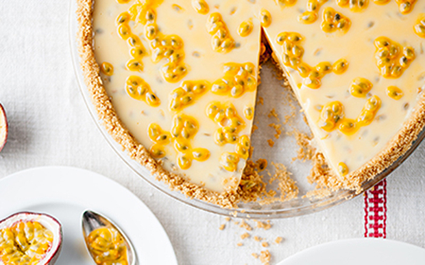 Monta la crema para batir con el azúcar glas y el queso ricotta; reserva. Cuece la pulpa de maracuyá con el azúcar durante durante 10 minutos a fuego medio y enfría por completo. Monta una cama de crema sobre las bases de tartas, termina con algunas cucharadas de la salsa de maracuyá y lleva a la mesa.